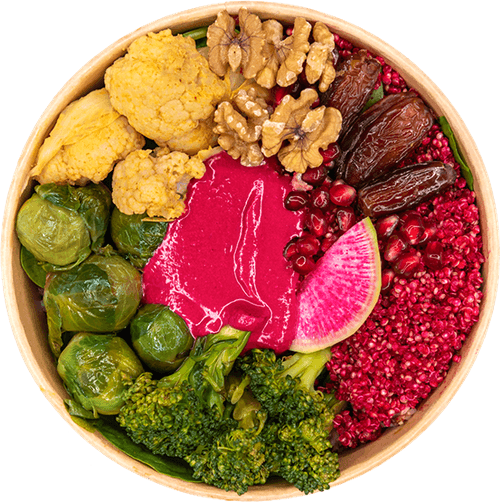 Red rice with salad in Wafu/lemon dressing, baby spinach, pre-cooked cauliflower fried in curry paste and coconut milk, cooked pumpkin with coriander powder and coconut flakes, avocado slices, shelled edamame in sesame oil, fried tempeh marinated in peanut, Wafu, lemon, salt, and ginger sauce overnight. Pomegranate topping and homemade beetroot hummus (made with chickpeas, beetroot, lemon, garlic, salt, cumin).